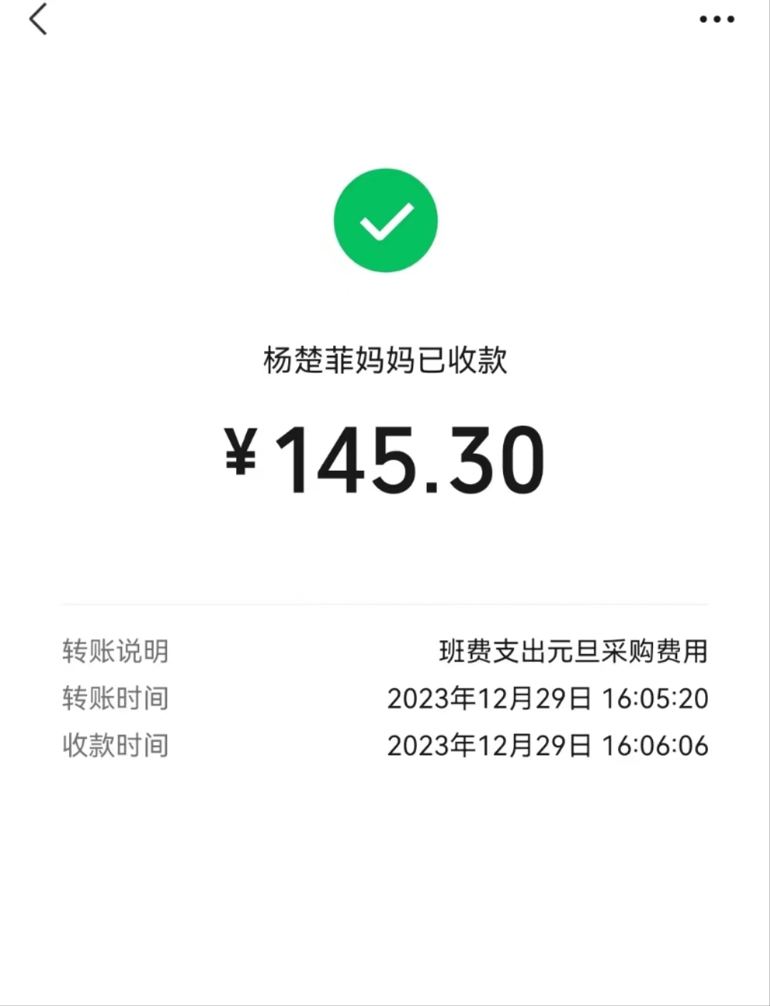 18. 2023-12-29 * 四叶草班班费支付杨楚菲妈妈购置元旦联欢会用的饺子和一次碗筷 -145.30 CNY