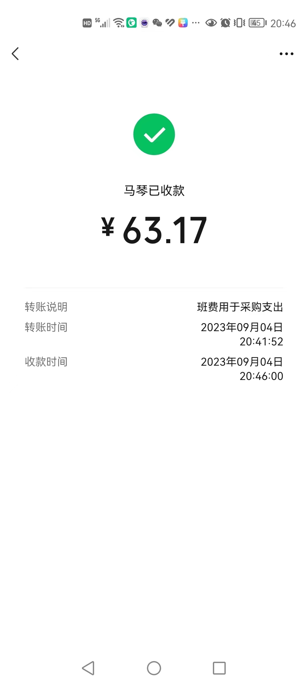 2023-09-03 * 四叶草班班费支付雷诗淇妈妈教室装扮材料费 -63.17 CNY